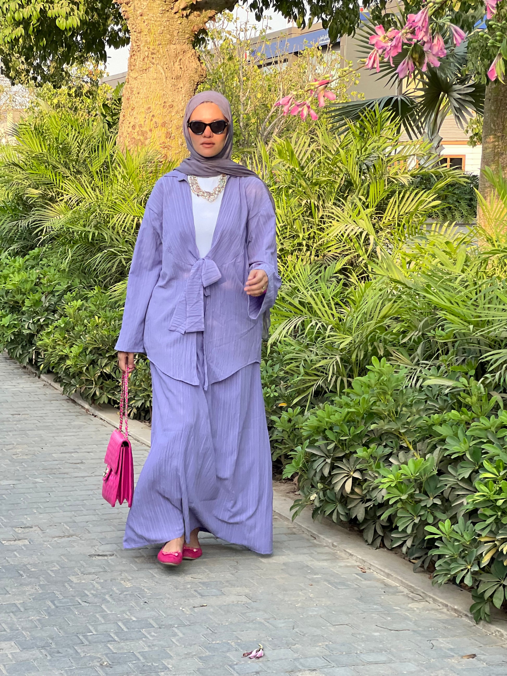 طقم أنيق من قطعتين يتكوّن من كارديجان وجيب، مُصمَّم بخامة كوريشة قطن خفيفة ومريحة، مثالية للإطلالات الصيفية.