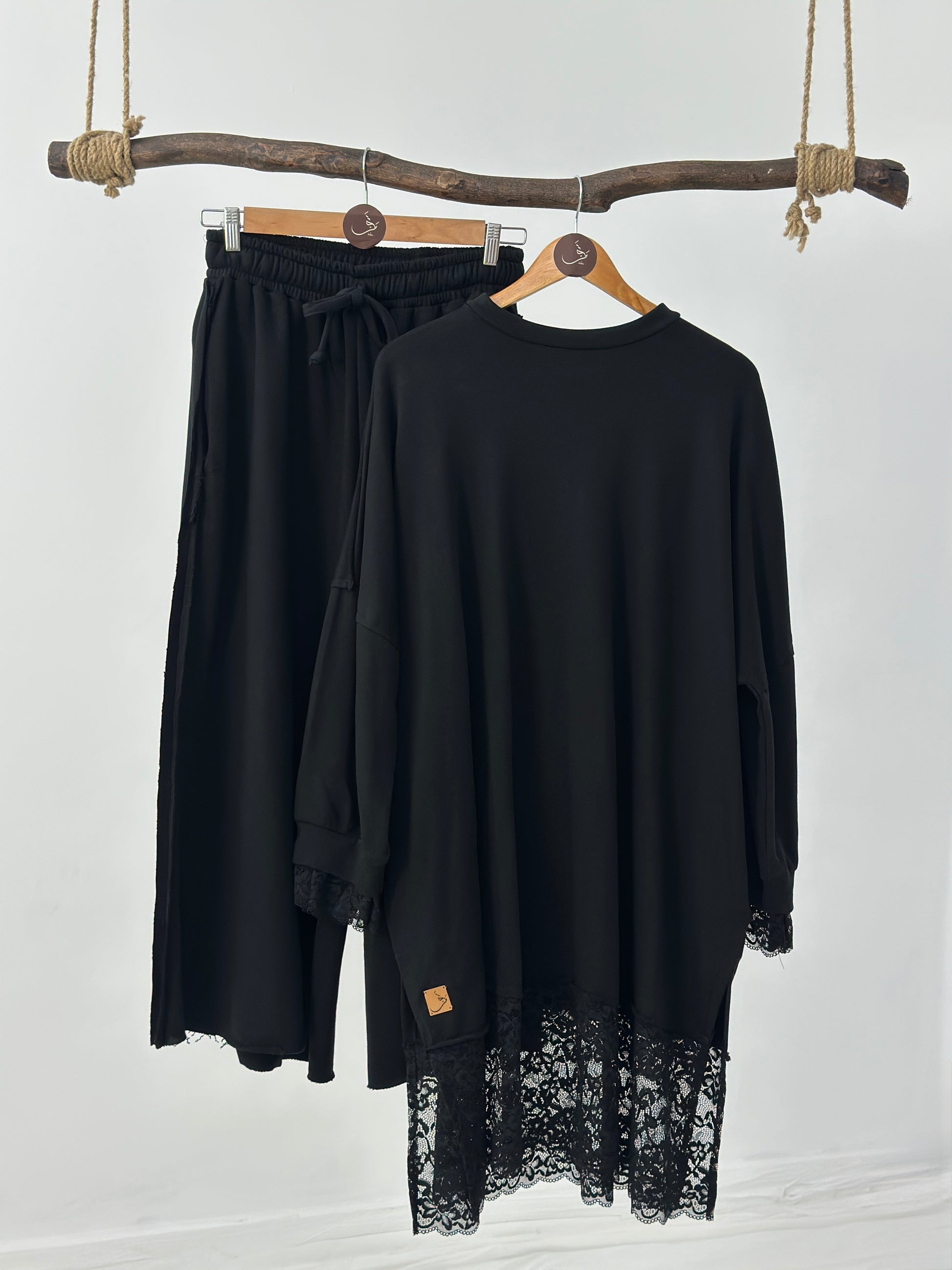 Melton lace-trim set consisting of a relaxed-fit sweatshirt with lace detailing at the hem,