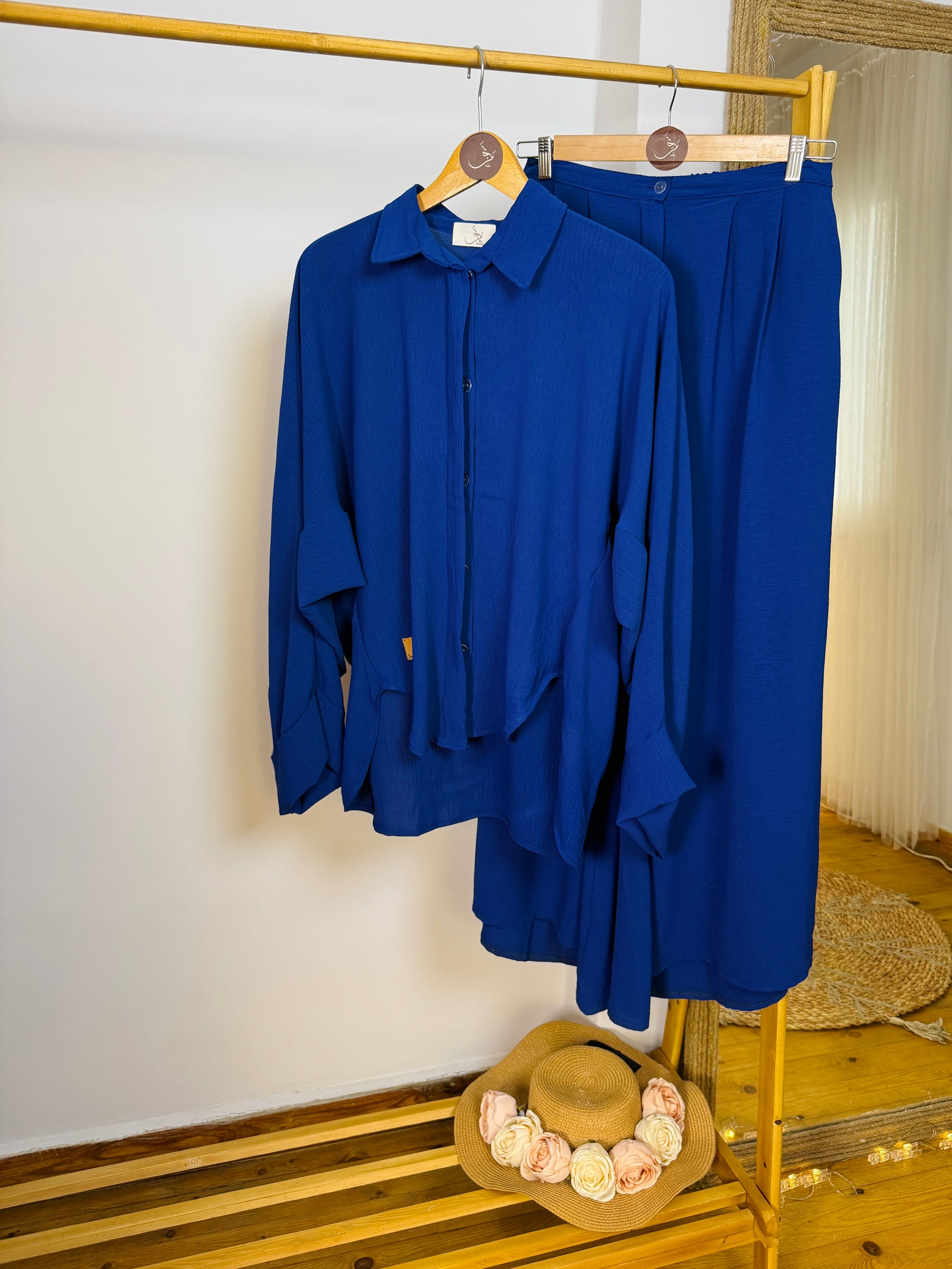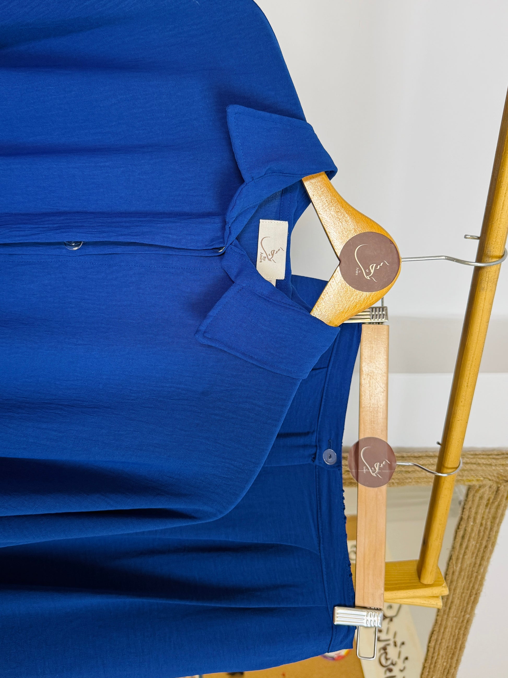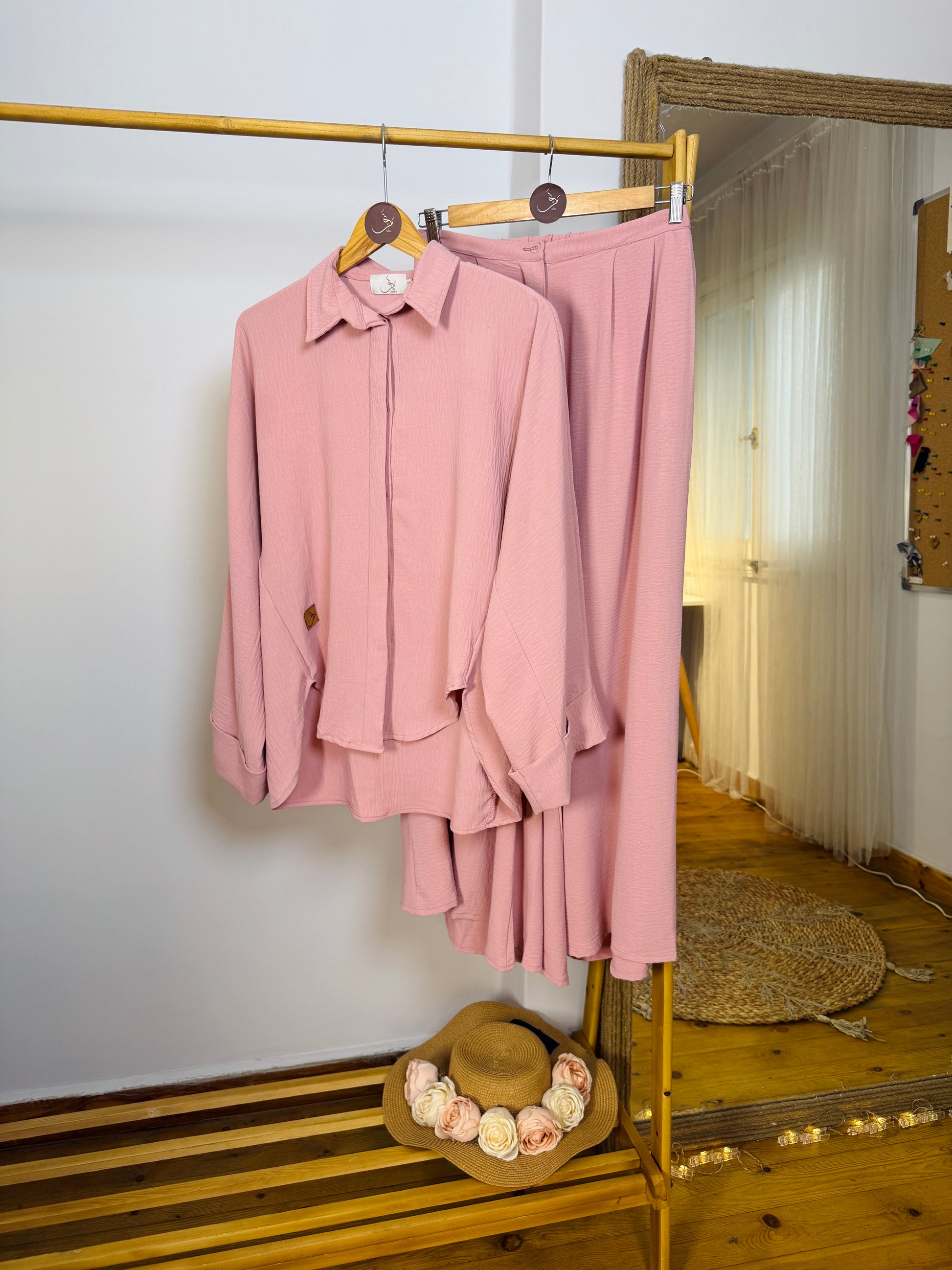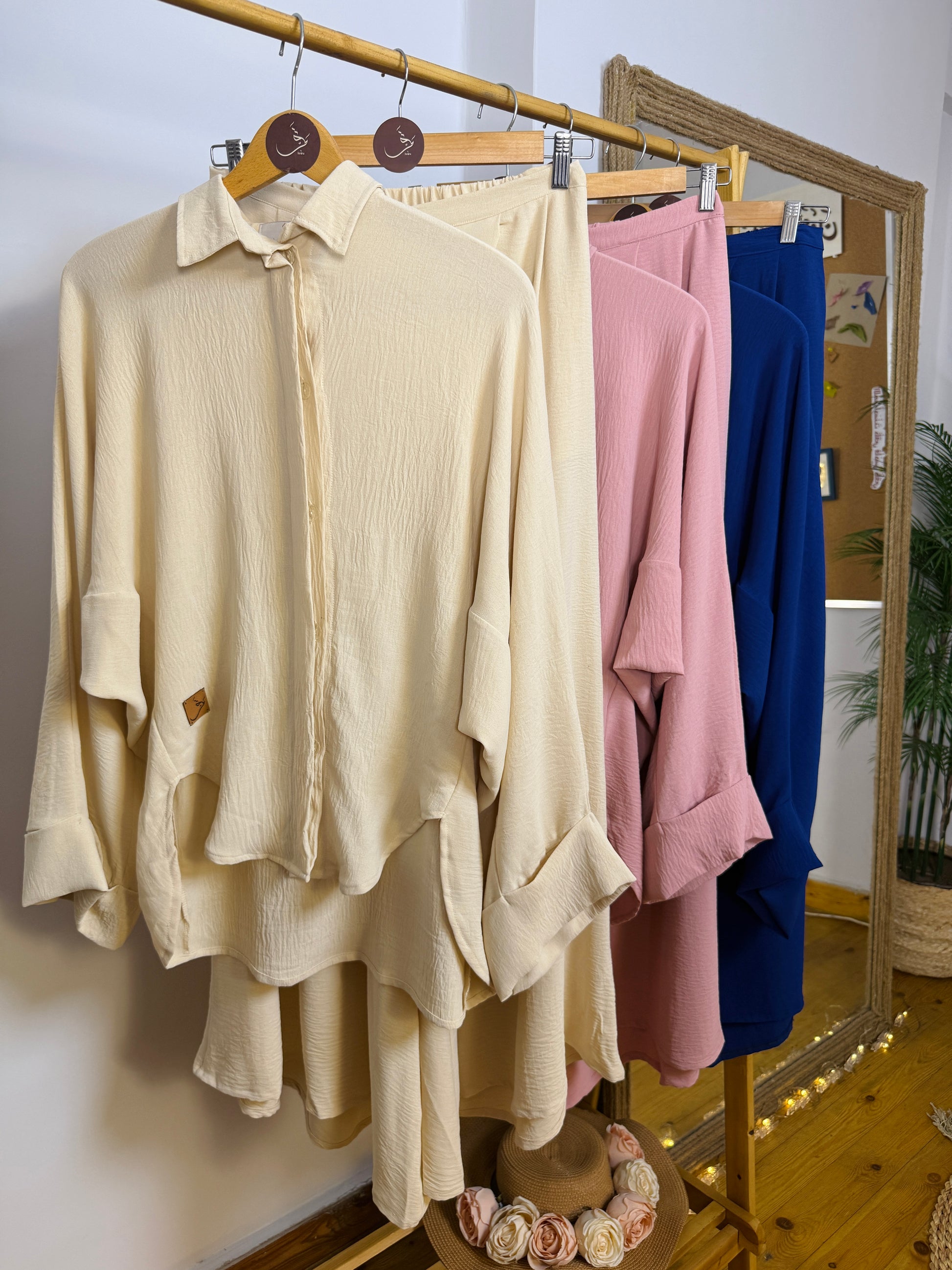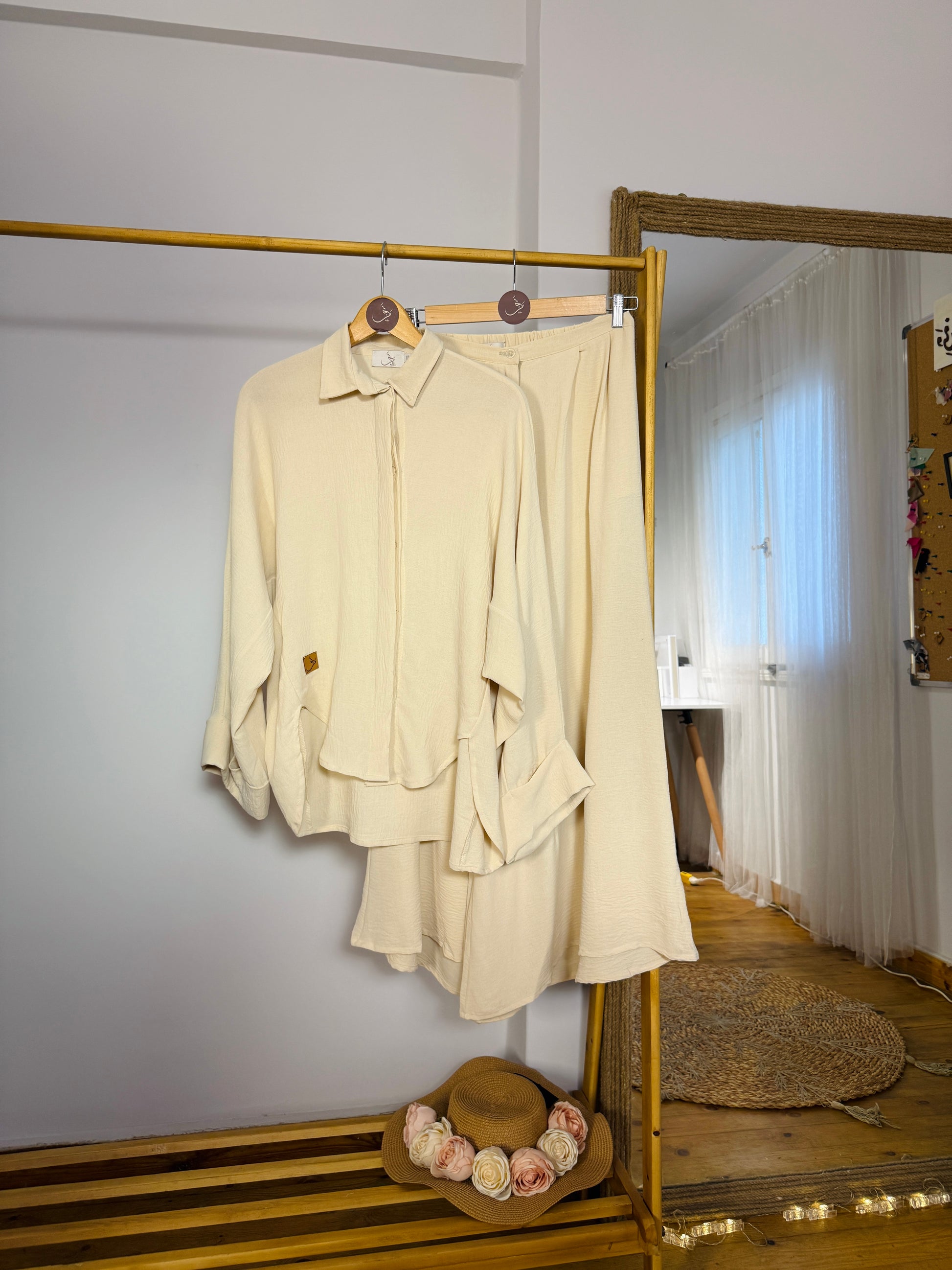 طقم واسع ومريح بخامة الكتان الفرنسي الناعمة، تصميم عملي تقدرّي تنسقيه بطرق متعددة حسب ذوقك.