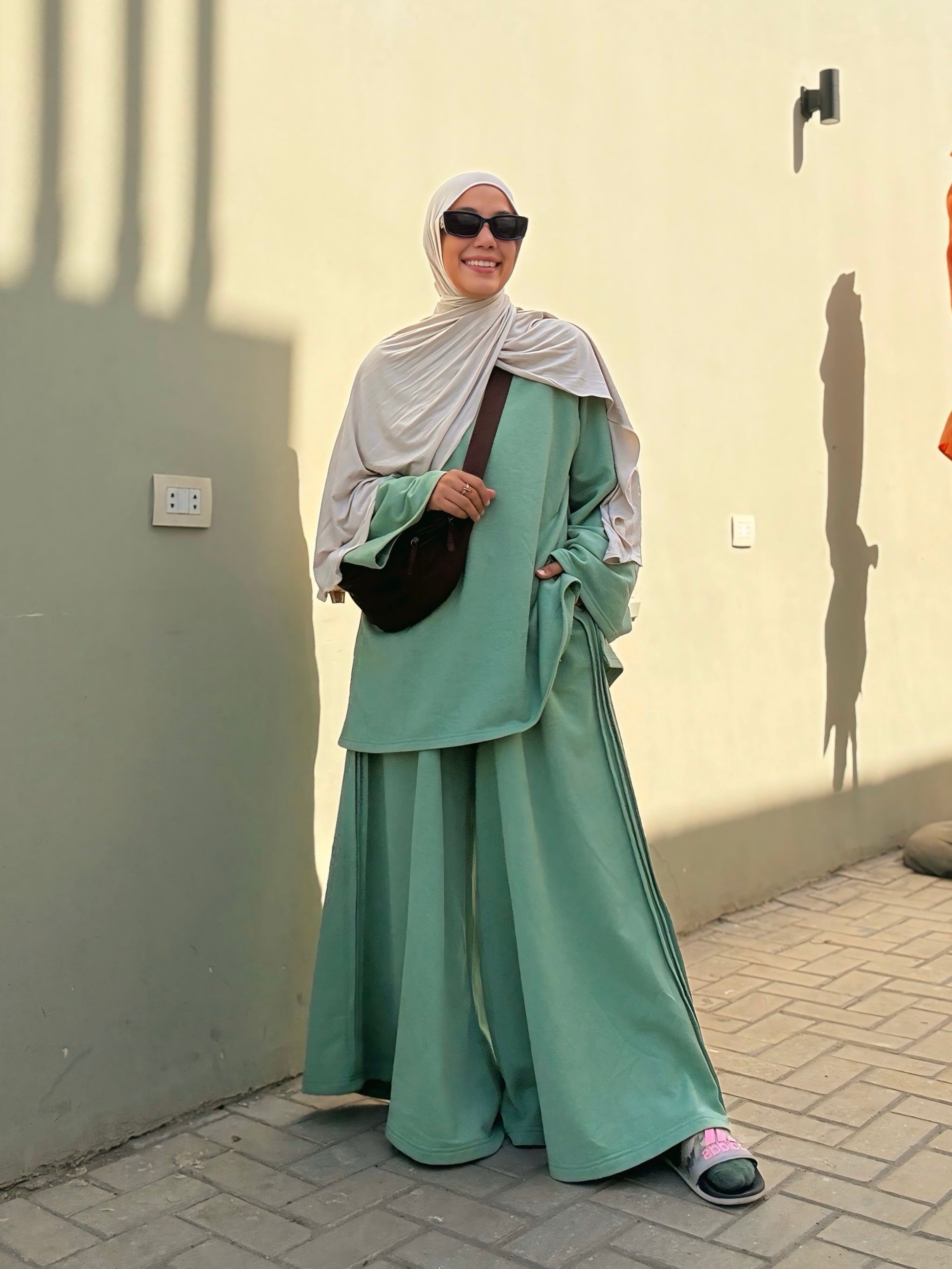 طقم مريح وعملي مكوّن من توب أوفر سايز مع بنطلون واسع.