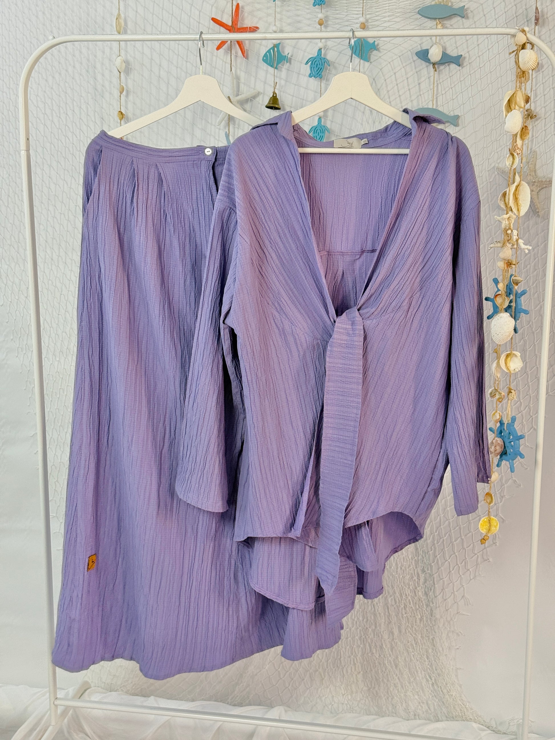 A stylish two-piece set featuring a lightweight crochet cotton cardigan paired with a matching skirt – perfect for breezy summer days.