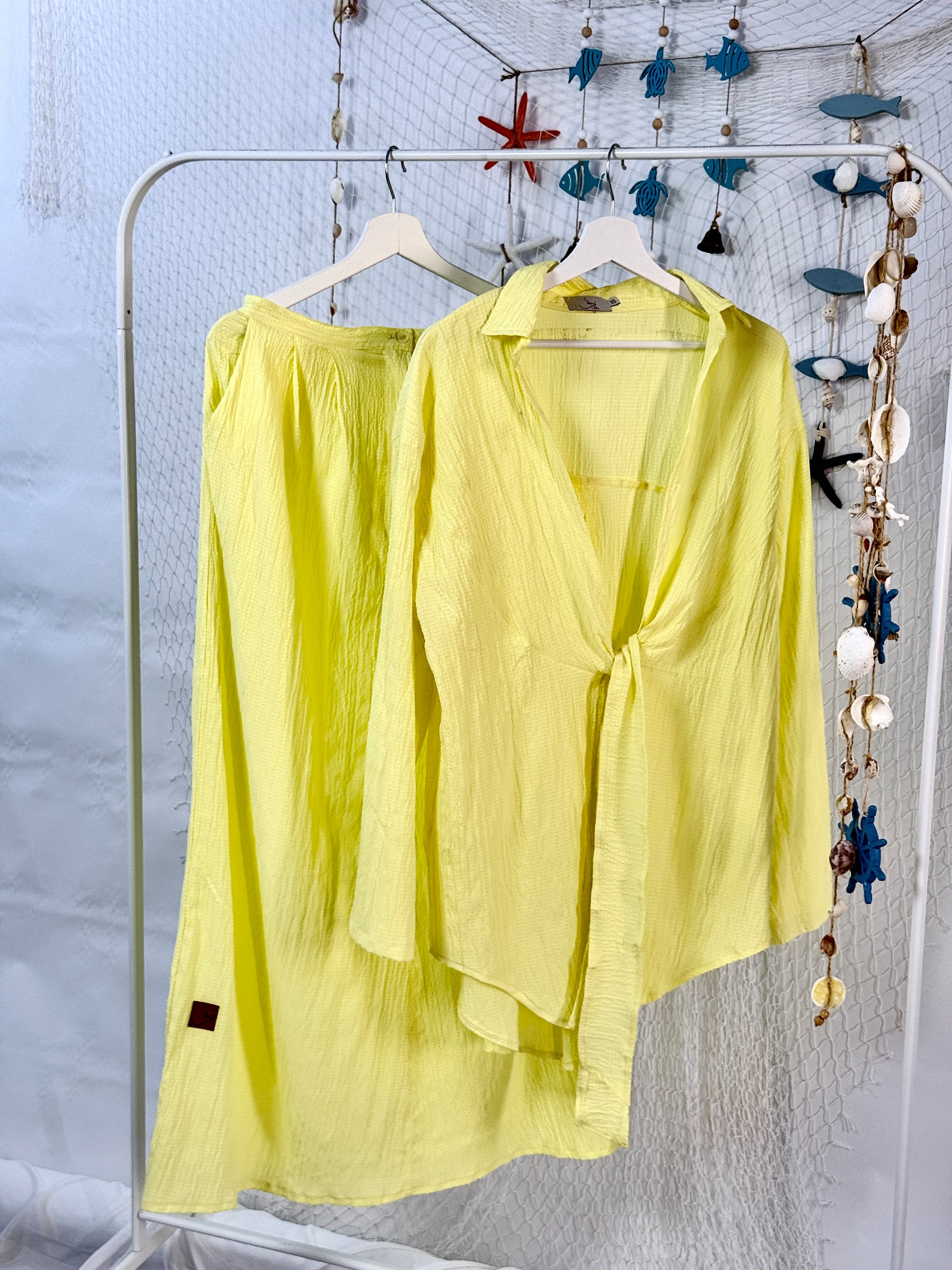 طقم أنيق من قطعتين يتكوّن من كارديجان وجيب، مُصمَّم بخامة كوريشة قطن خفيفة ومريحة، مثالية للإطلالات الصيفية.
