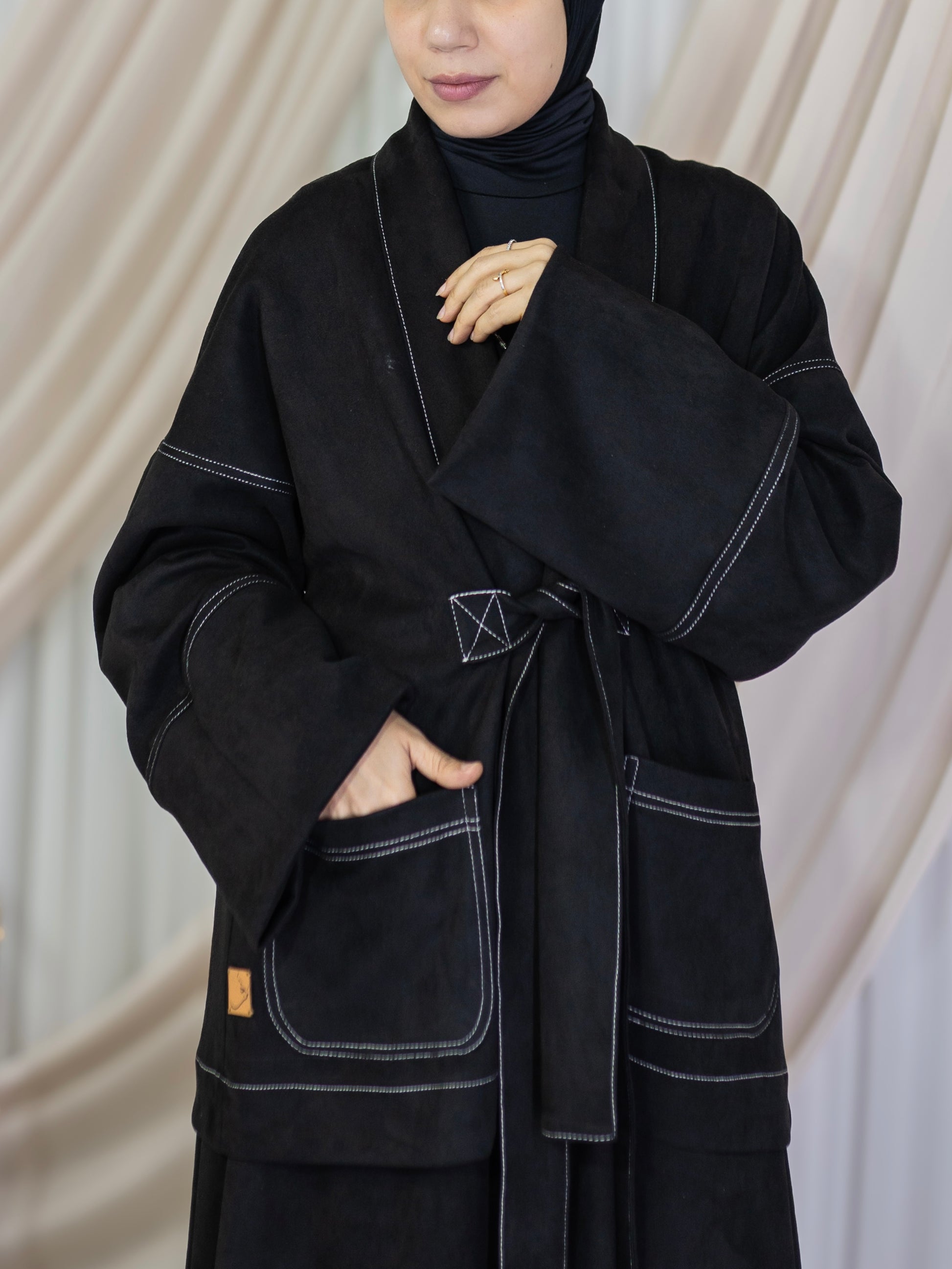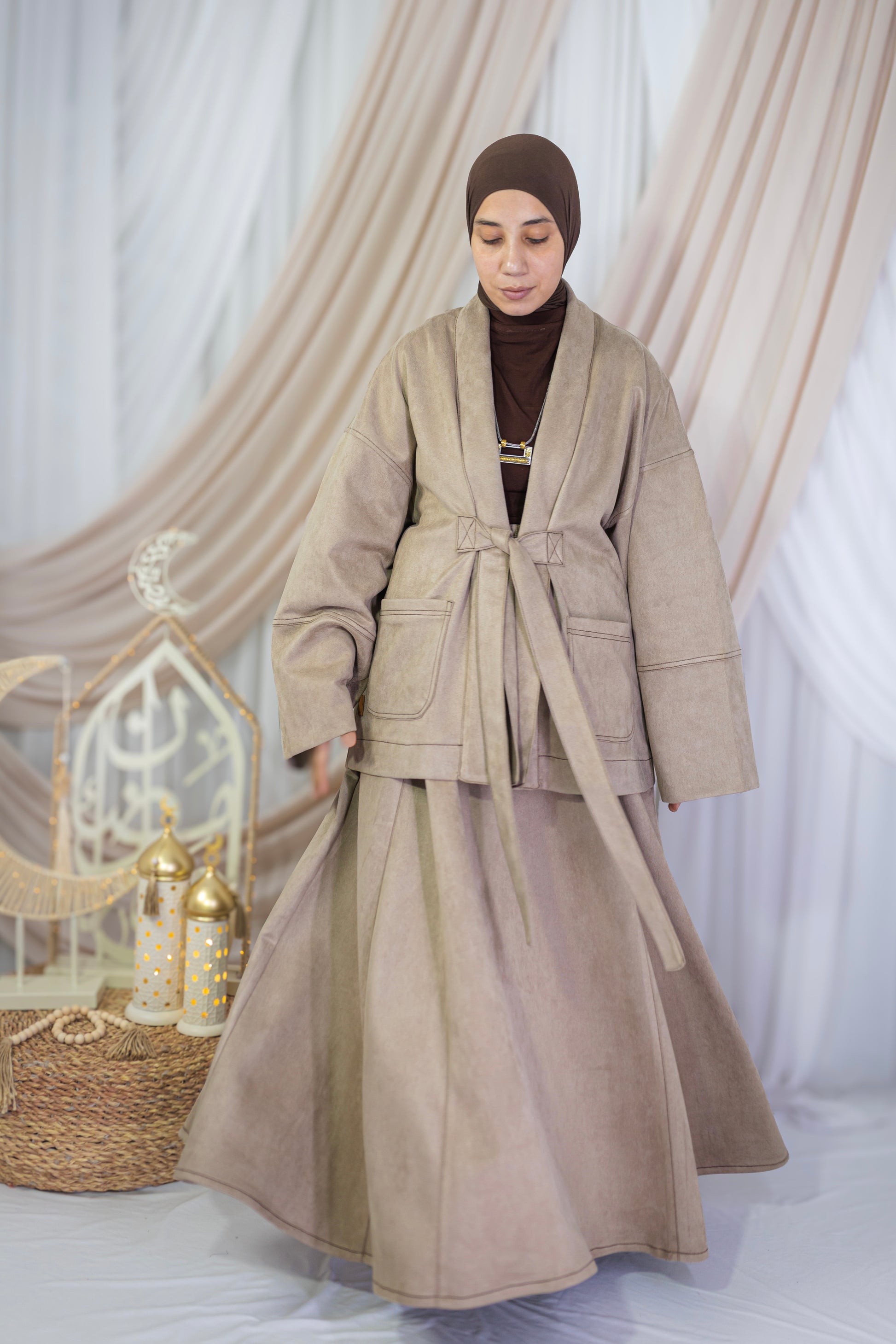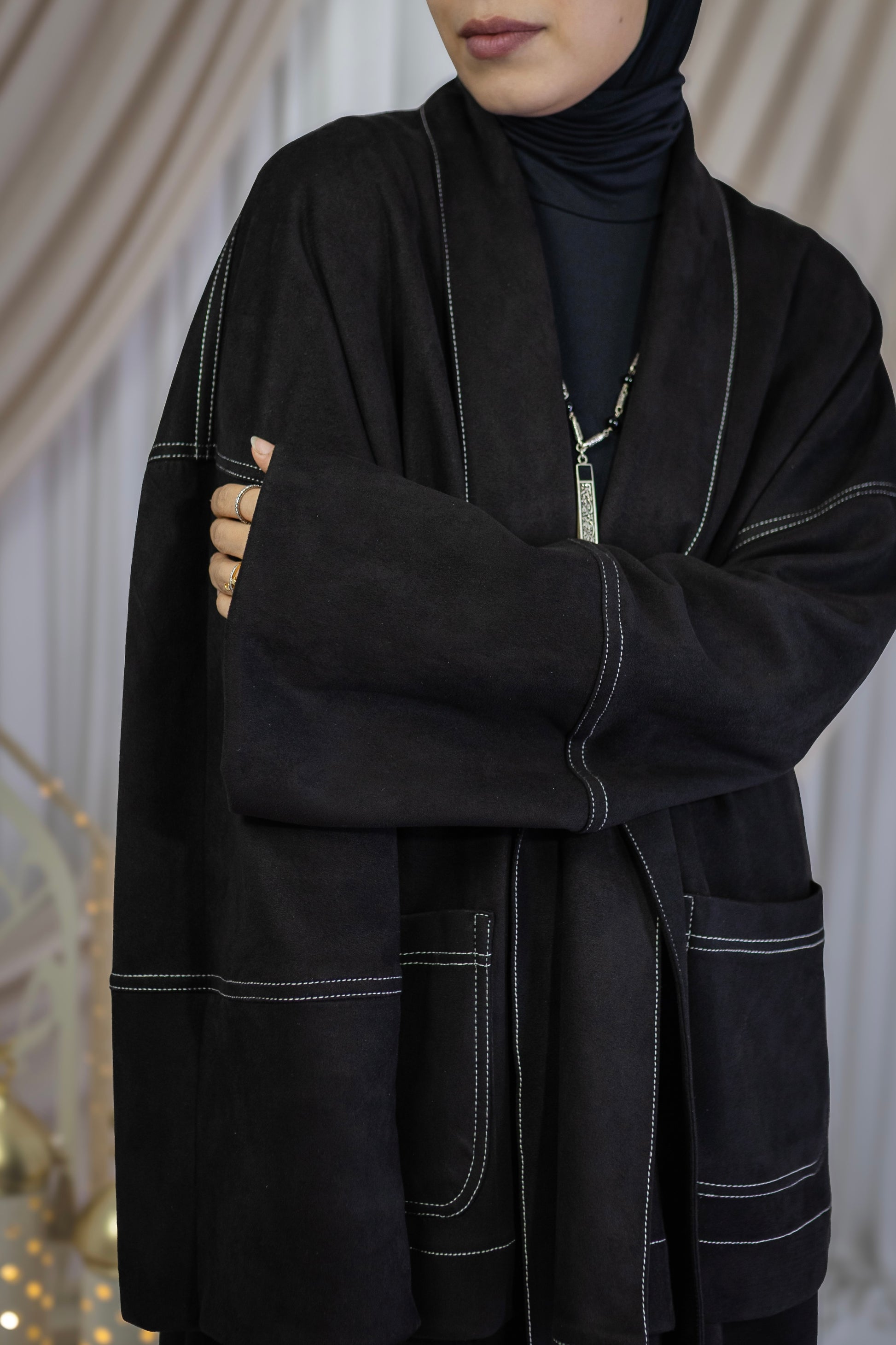 ست مكوّنة من جيب واسعة مع جاكيت من خامة السويدي الشمواه، بتصميم مريح وانسيابي يعطي مظهر مرتب ومتوازن.