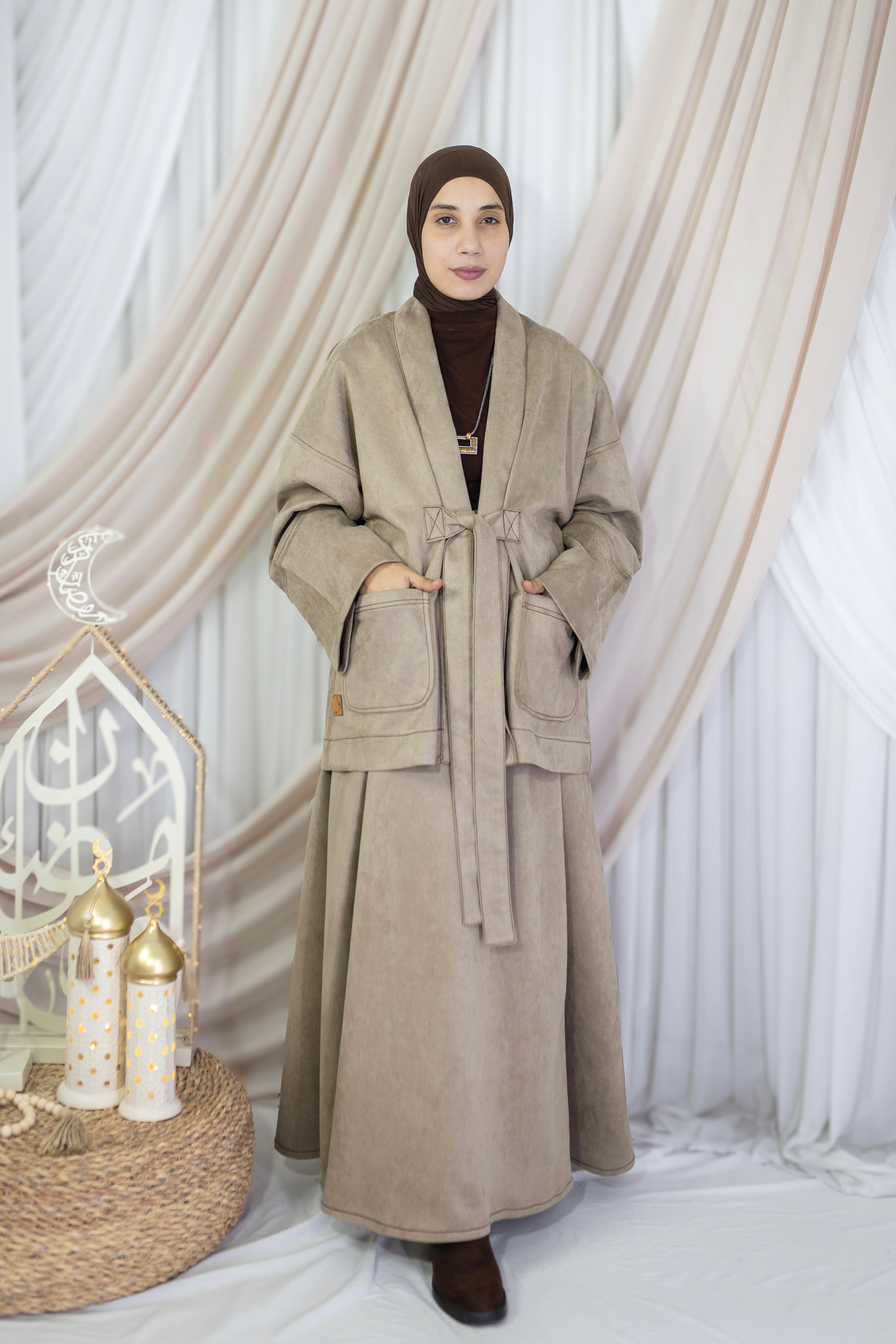 A two-piece set consisting of a wide skirt and a structured jacket, made from suede fabric for a clean, flowing appearance.